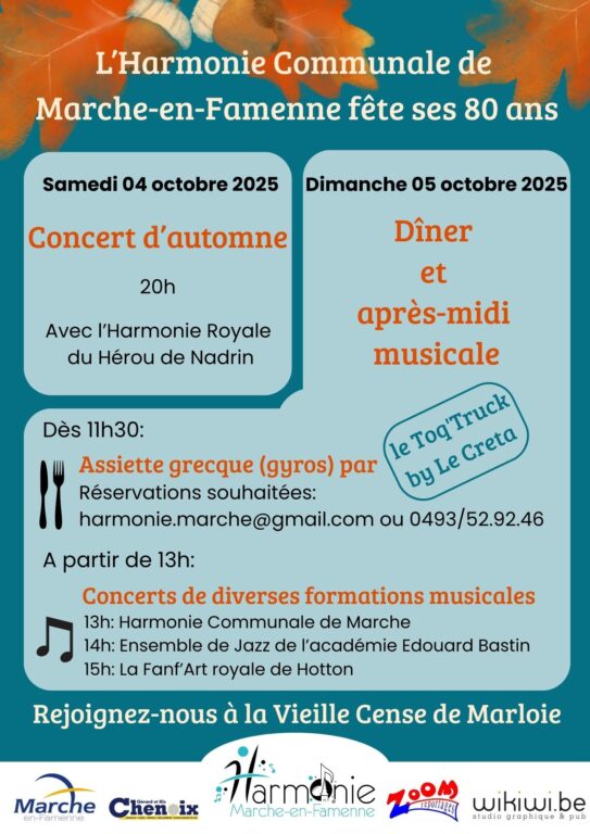 Rejoignez nous pour un week-end musical ce 04 et 05 octobre 2025 à l’occasion des 80 ans de l ‘Harmonie. Rendez-vous à la Vieille Cense de Marloie.